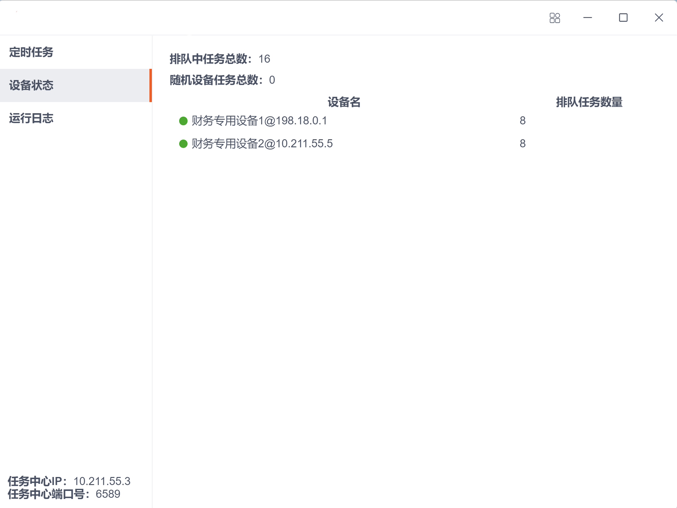 可以查看所有已链接设备的状态,包括在线、离线、待运行的总任务数量、当前设备的待运行任务数量