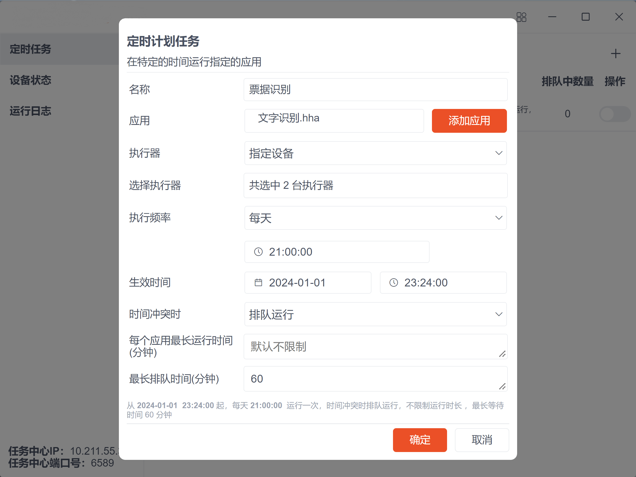 首次启动执行器需要配置任务中心的IP地址及端口号,本机名称任意,所有配置可以随时修改,立即生效