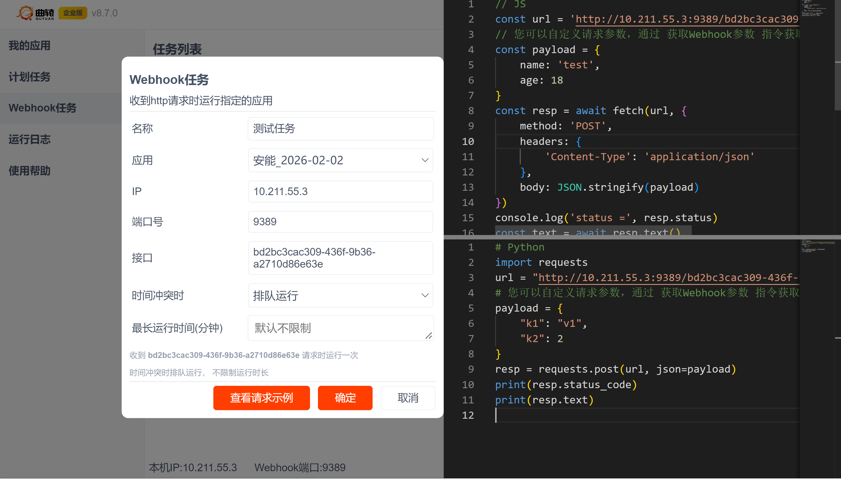 点击查看请求示例可以看到Python、JS的请求代码,直接复制运行代码即可触发Webhook任务。