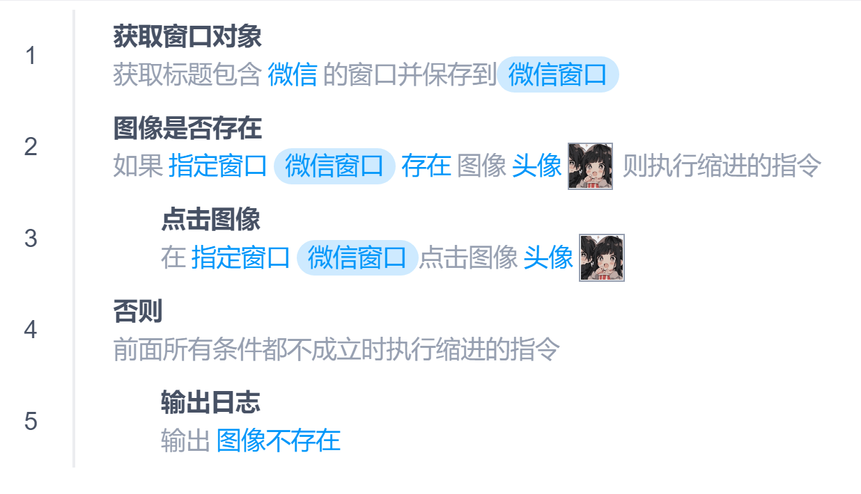 指令条件判断图像是否存在本页总览图像是否存在 指令说明 用于判断指定的图像是否存在,可以判断整个屏幕、当前激活的窗口、指定的窗口 可以选择彩色匹配或者灰色匹配,灰色匹配时会自动转换成灰色图片并进行匹配 若想匹配任意颜色的图片可以选择灰色匹配,例如匹配Logo图片 该指令会通过Python OpenCV 比对图像,对图片、屏幕大小敏感,若搭建流程的电脑和运行流程的电脑屏幕分辨率不同可能会导致无法匹配图像 提示如果能通过捕获元素方式建议优先使用捕获元素方式,图片匹配准确率无法达到100% 示例 判断指定的窗口是否有特定的图像