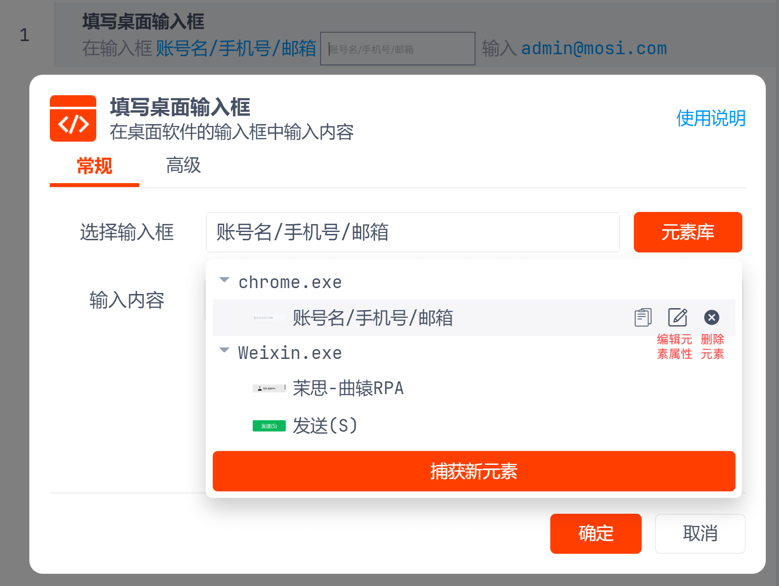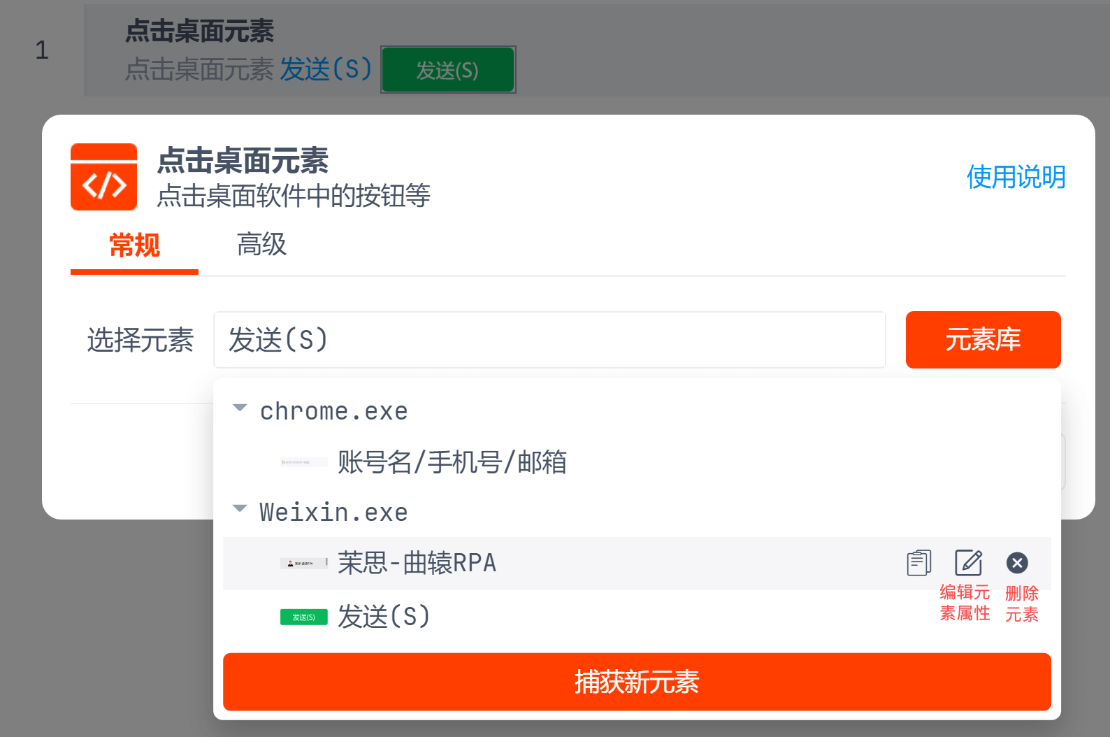 - 捕获微信的聊天输入框时,元素属性中可能会有当前联系人的名称,这时不要勾选该属性,否则和其他人聊天时会找不到元素