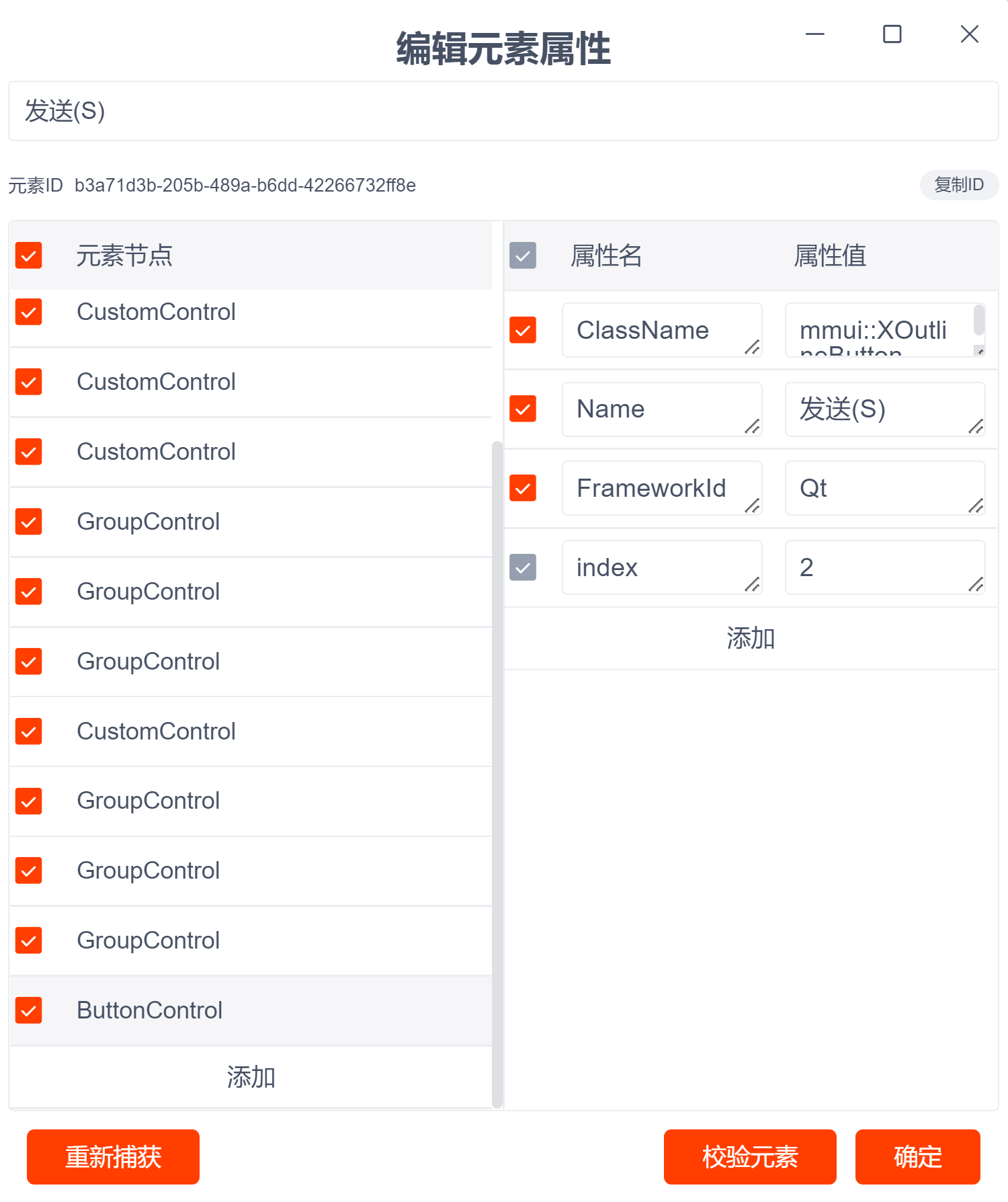 捕获到的元素会显示在下方,点击即可选择元素,鼠标移动到元素上时会显示修改元素属性、删除元素按钮。
