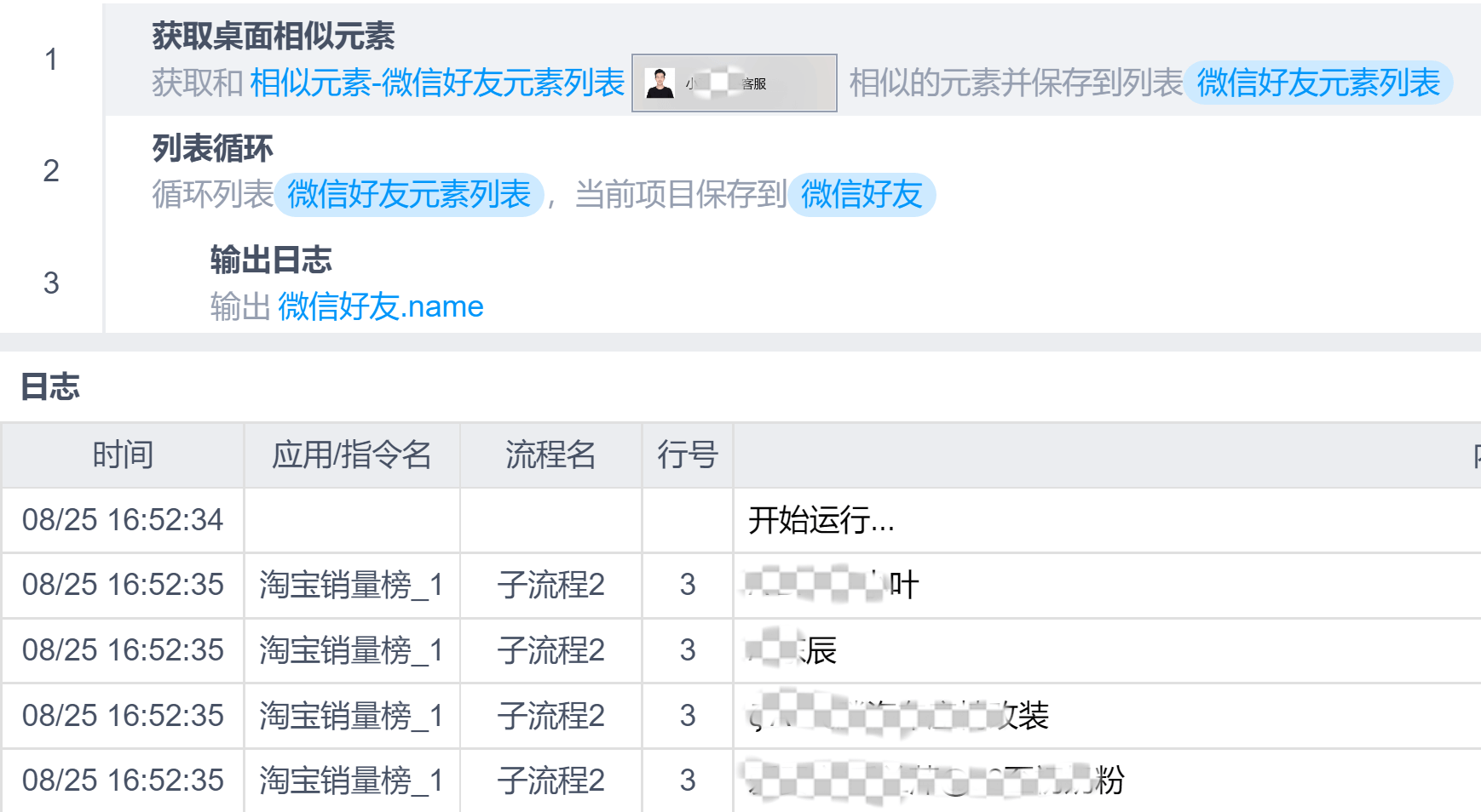 指令桌面软件自动化获取桌面相似元素本页总览获取桌面相似元素 指令说明 获取桌面软件中的相似元素并保存到列表 可以指定等待元素出现的最长等待时间(秒),若元素未出现则一直等待,直到元素出现为止,若超过最长等待时间后元素仍未出现则返回空列表 提示 捕获元素参考 捕获及编辑桌面元素属性 示例 获取全部微信好友名称