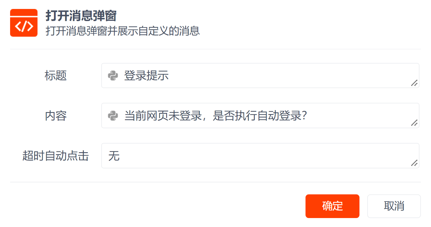 指令对话框打开消息弹窗本页总览打开消息弹窗 指令说明 使用该指令可以在自动化任务执行时弹出窗口,让用户选择不同的操作,可以结合是否点击指定的按钮指令执行不同的流程。只有消息窗口关闭后流程才会继续执行,否则一直等待