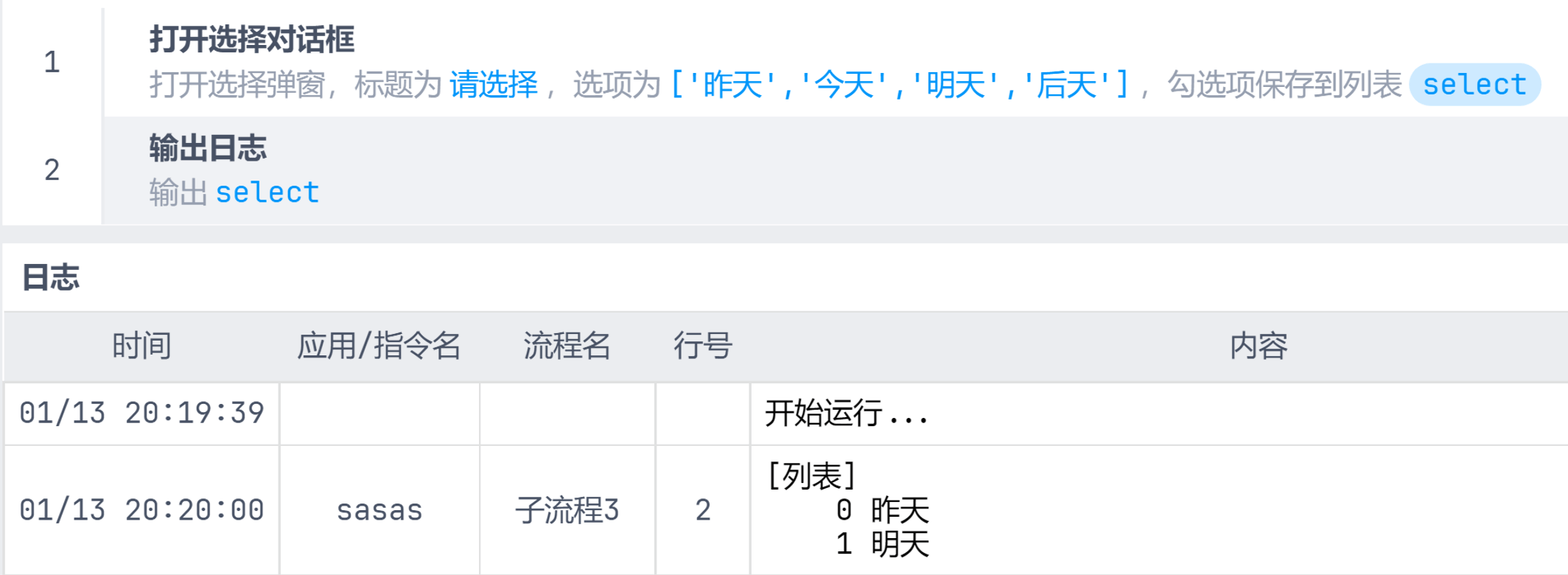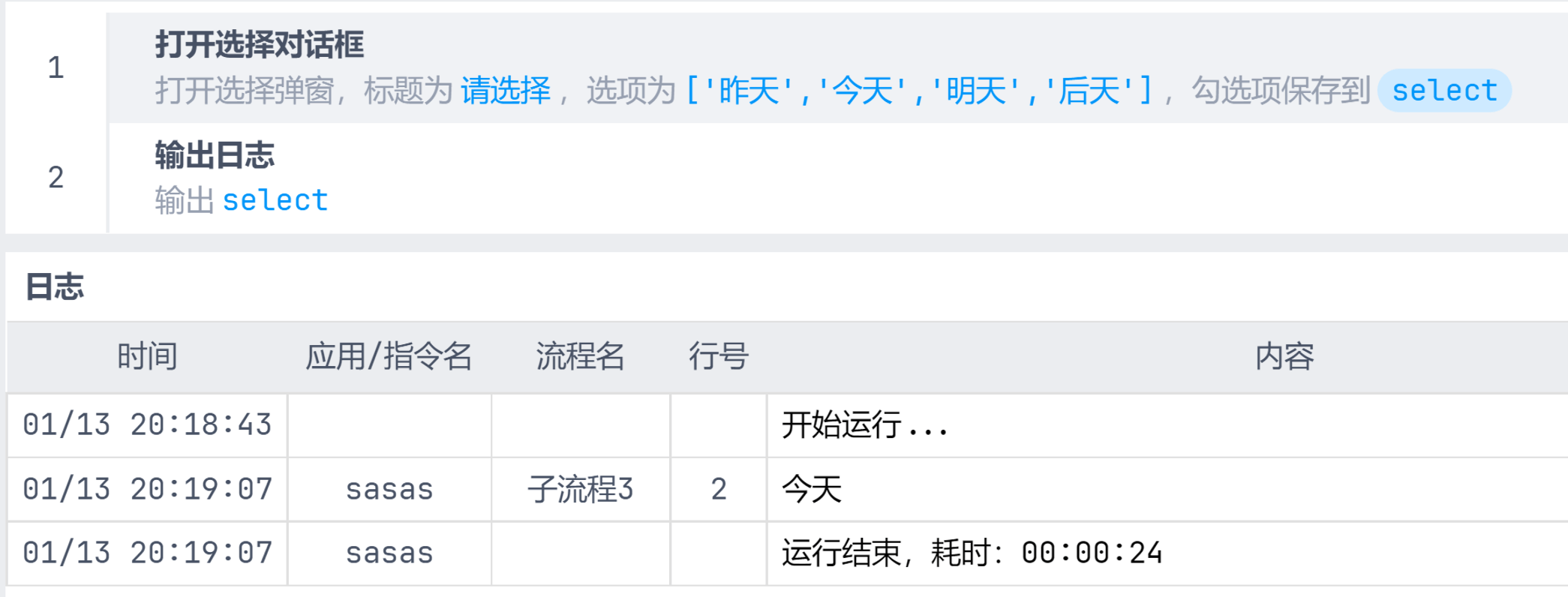 该指令可以在自动化任务执行时弹出窗口,让用户选择,可以配置单选、多选。只有输入窗口关闭后流程才会继续执行,否则一直等待