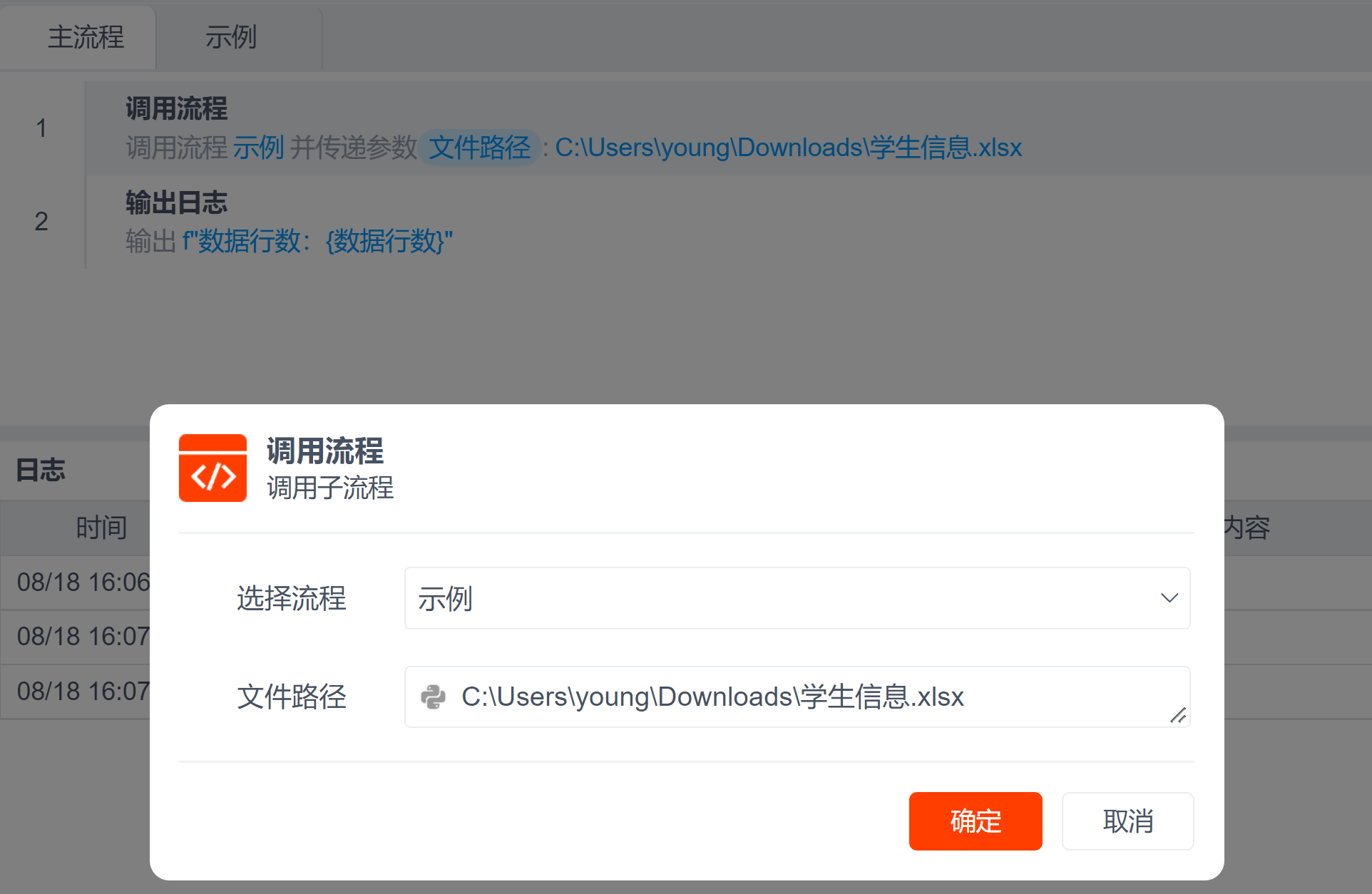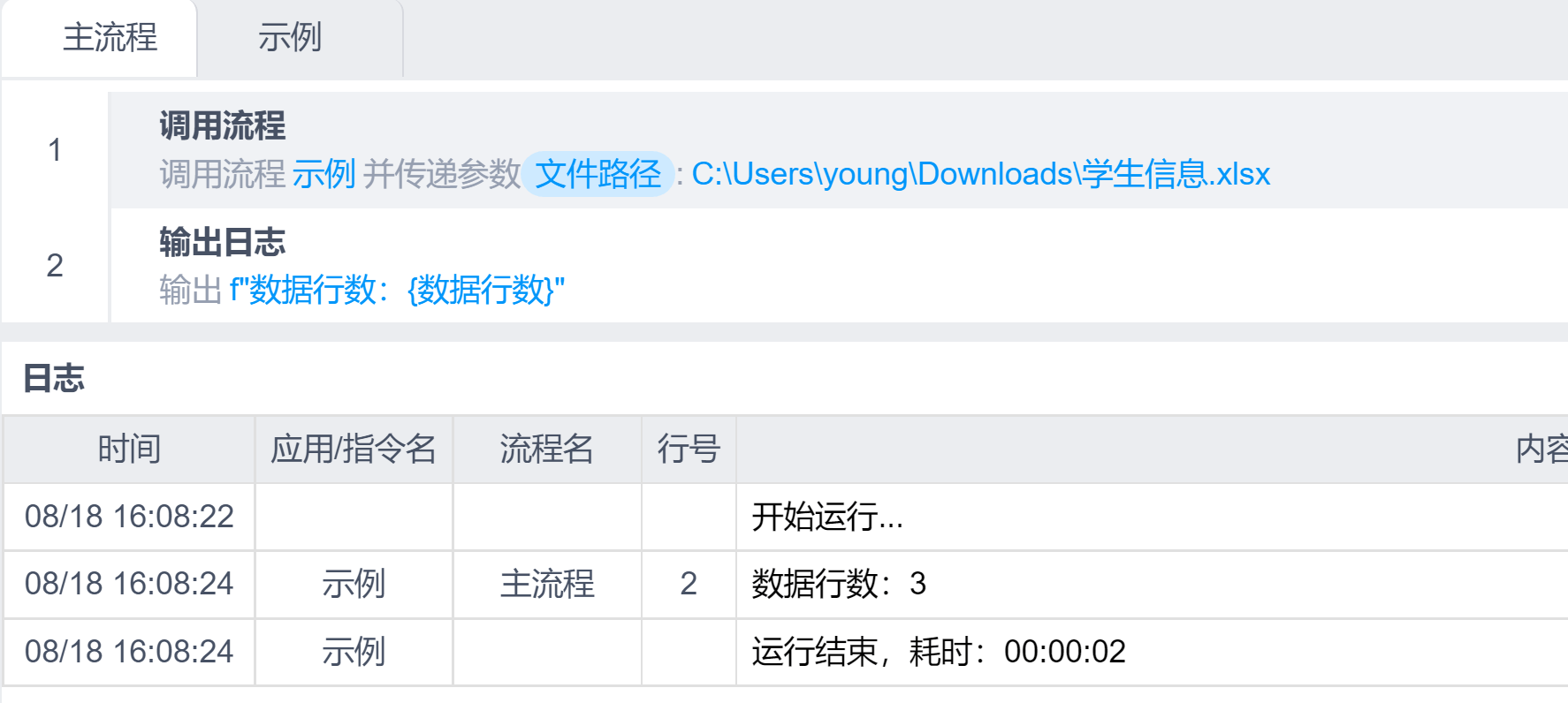 指令流程结束流程本页总览结束流程 指令说明 结束流程后当前流程的所有指令不再执行,流程会从调用流程处继续执行。结束流程时可以返回指定的数据 示例 子流程,获取指定excel文件的行数 调用子流程。直到子流程执行结束流程或者子流程执行完成后当前流程才会继续执行。例如示例流程执行第4行后主流程才会执行第2行 输出调用结果