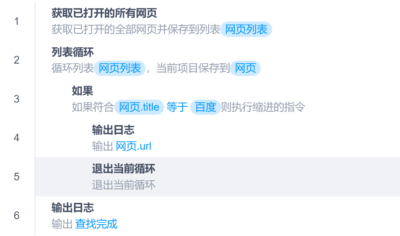 指令循环退出当前循环本页总览退出当前循环 指令说明 退出当前循环,继续执行后续指令。可以搭配次数循环、条件循环、列表循环、无限循环一起使用 示例 遍历所有网页,直到找到百度网页为止。假设当前已经打开的网页分别是京东、淘宝、百度、小米,则流程行号执行顺序为:1 -> 2 -> 3 -> 2 -> 3 -> 2 -> 3 -> 4 -> 5 -> 6