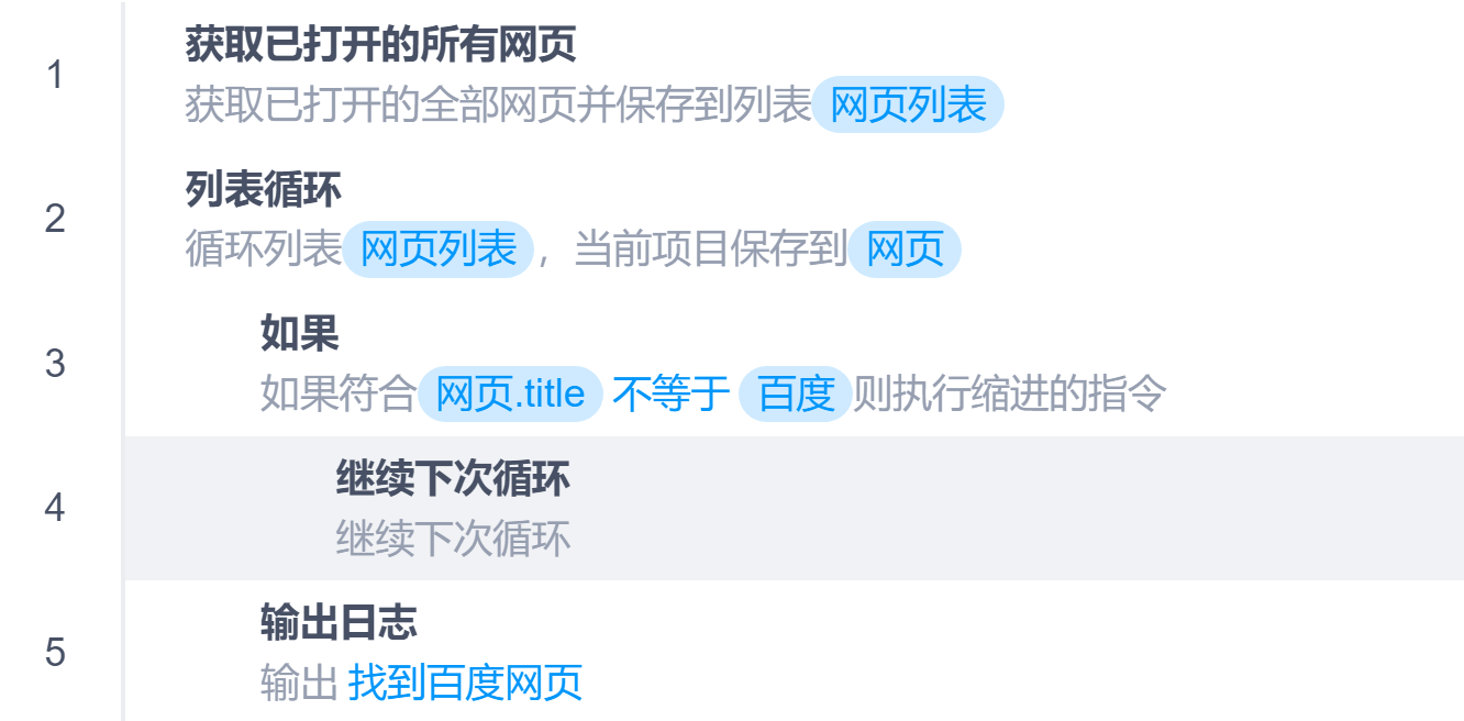 指令循环继续下次循环本页总览继续下次循环 指令说明 跳过后续指令,从循环开始处继续执行。可以搭配次数循环、条件循环、列表循环、无限循环一起使用 示例 获取百度网页。假设当前已经打开的网页分别是京东、淘宝、百度、小米,则流程行号执行顺序为:1 -> 2 -> 3 -> 4 -> 2 -> 3 -> 4 -> 2 -> 3 -> 5 -> 2 -> 3 -> 4
