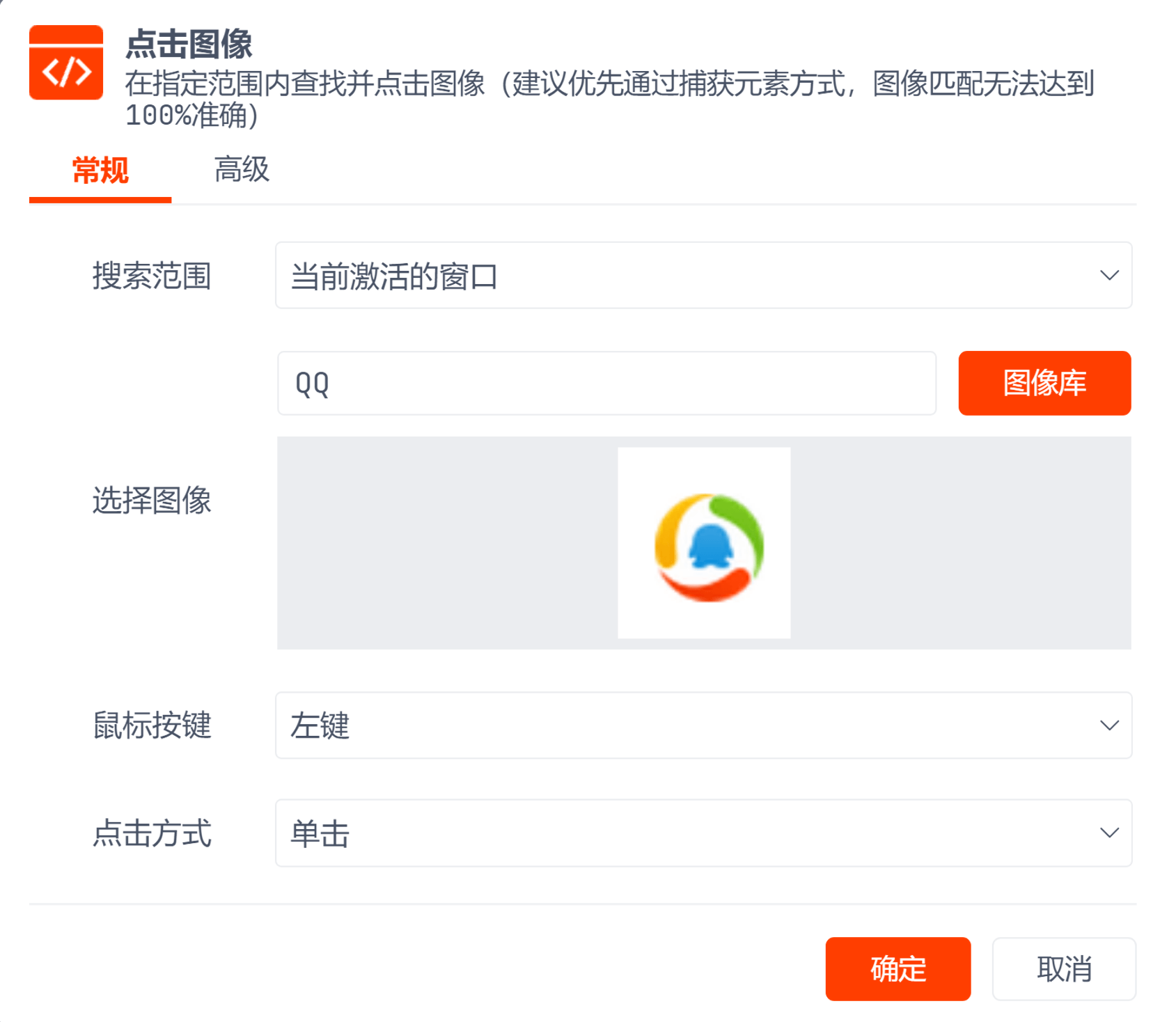 指令鼠标键盘点击图像本页总览点击图像 指令说明 点击指定的图像。该指令会通过Python OpenCV 比对图像,对图片、屏幕大小敏感,若搭建流程的电脑和运行流程的电脑屏幕分辨率不同可能会导致无法匹配图像