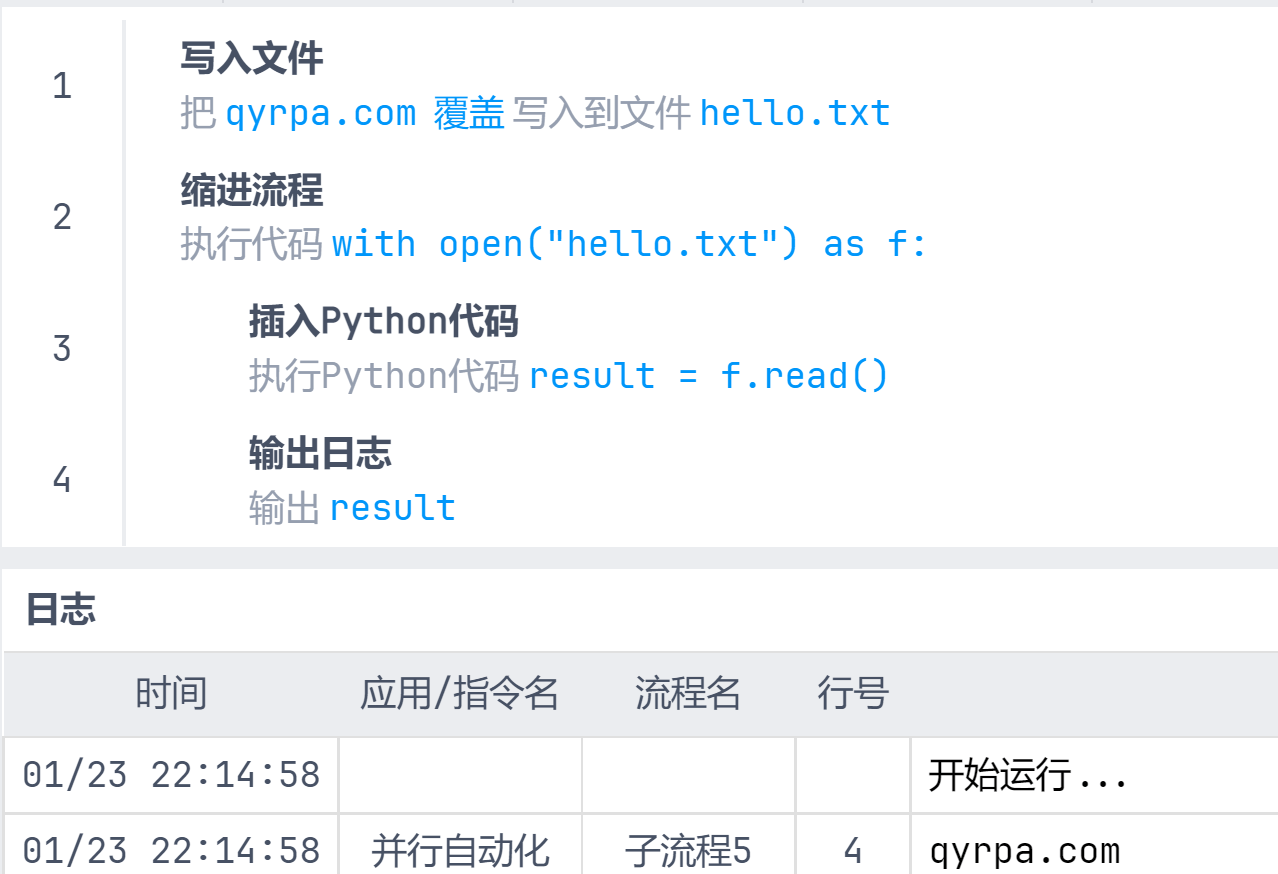 生成的Python代码write_file("hello.txt", "qyrpa.com",'覆盖', "自动")