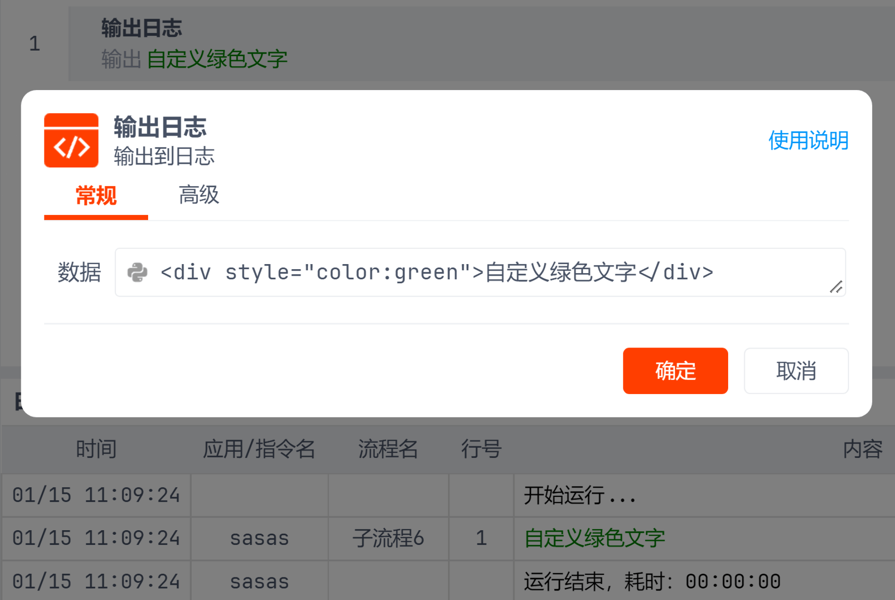 您可以通过该指令输出任意内容,输出的内容会显示在流程编辑器的