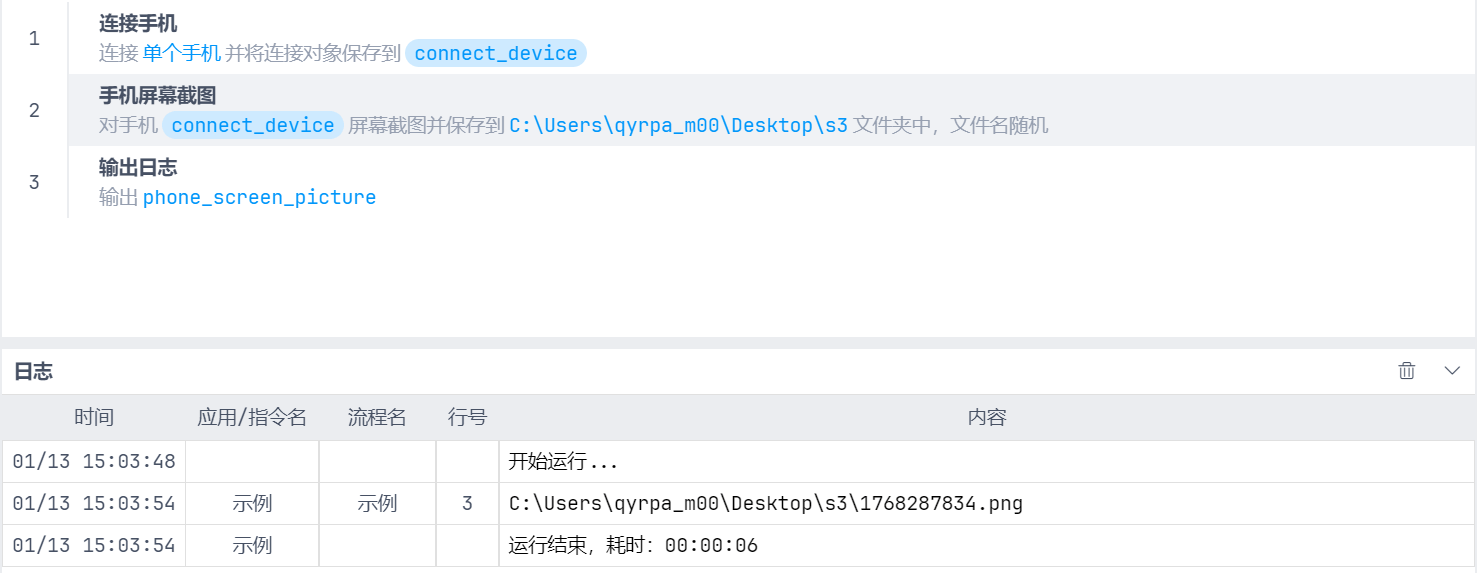 指令手机手机操作手机屏幕截图本页总览手机屏幕截图 使用条件 📱 手机已成功连接至电脑 功能说明 截图范围:整个手机屏幕 保存方式:可自定义保存目录 附加信息:支持获取图片坐标位置 操作流程 连接手机 → 设置保存路径 → 执行截图 → 查看结果 界面示例 提示需要先开启手机开发者选项并通过数据线连接手机和电脑,参考 连接手机 常见问题 参考手机常见问题