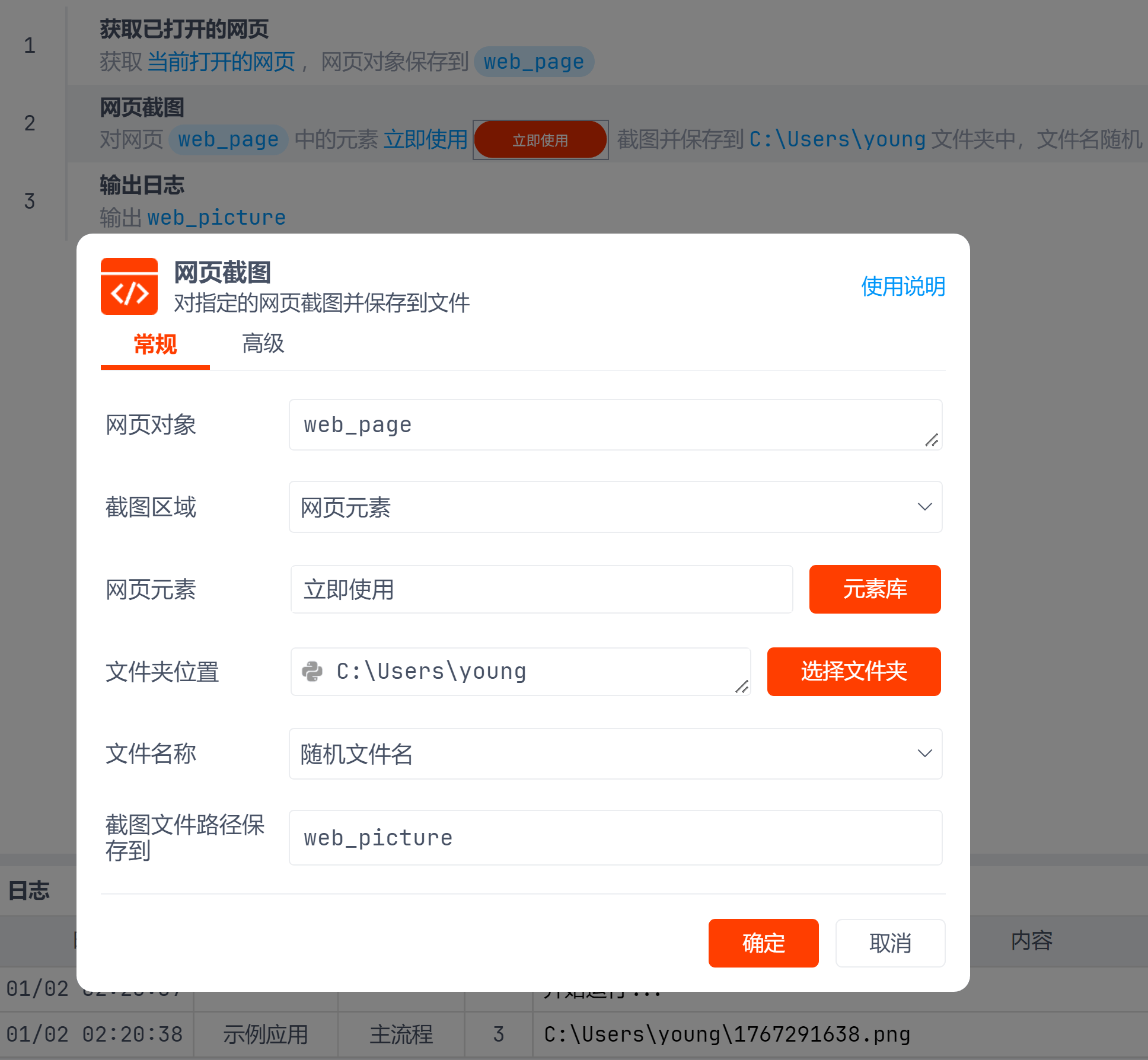 指令网页自动化数据提取网页截图本页总览网页截图 指令说明 对指定的网页或者网页元素截图并保存到文件。可以指定等待元素出现的最长等待时间(秒),若元素未出现则一直等待,直到元素出现再截图,若超过最长等待时间后元素仍未出现则触发错误 提示 需要先安装曲辕RPA浏览器插件 如何捕获及编辑元素属性参考 捕获及编辑网页元素属性 示例 常见问题 参考 网页操作常见问题