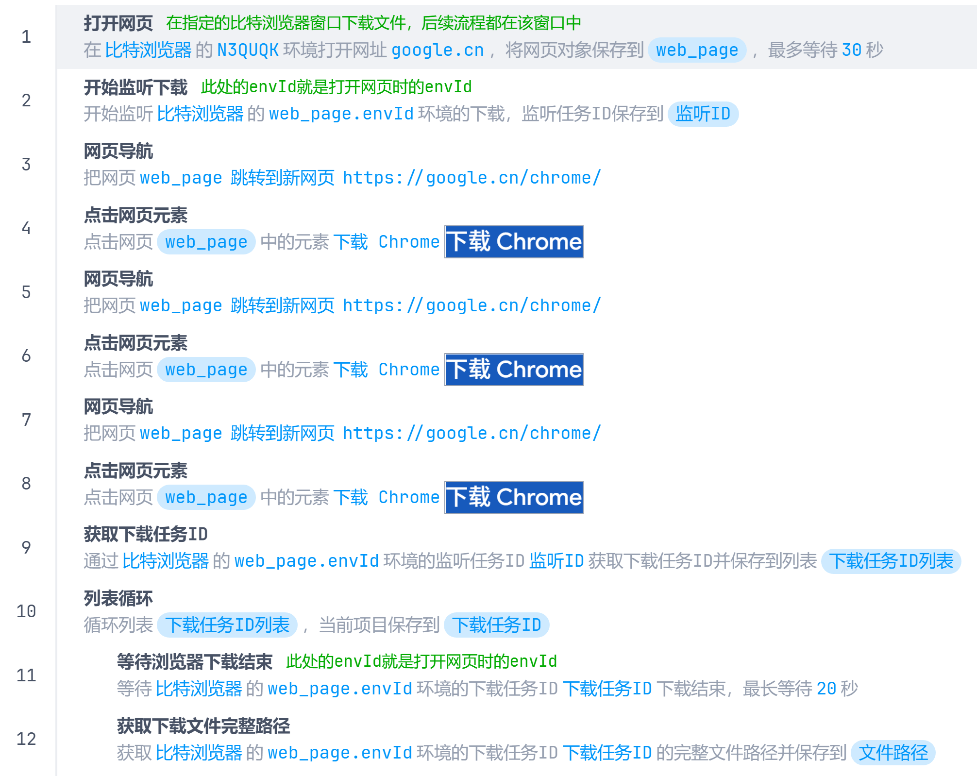 - 例如N3QUQK窗口开启下载监听,之后不管是点击N3QUQK窗口中网页的下载按钮还是通过 浏览器下载文件 指令都可以获取到N3QUQK窗口的下载状态以及下载文件的完整路径。