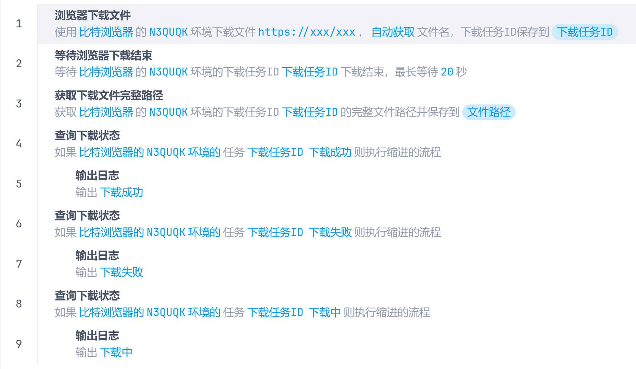 浏览器下载文件指令下载文件,可以指定存储到本机的文件名称,若本机已存在同名文件则自动修改名称。 - 等待指定的下载任务执行结束,可能下载成功,也可能下载失败,若指定的 等待时长a 大于 实际下载时长b,则 等待浏览器下载结束 指令实际等待b秒,否则等待a秒