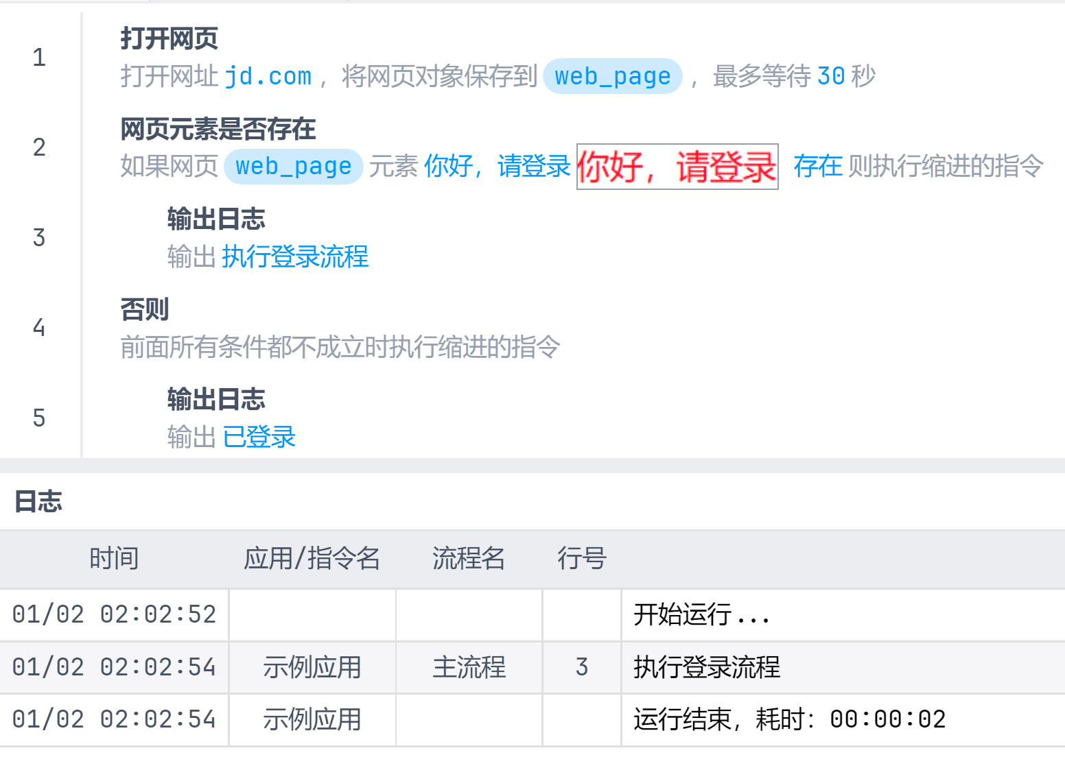 如果网页存在/不存在指定的元素则执行缩进的指令,例如您可以判断是否存在登录元素决定是否需要执行登录。