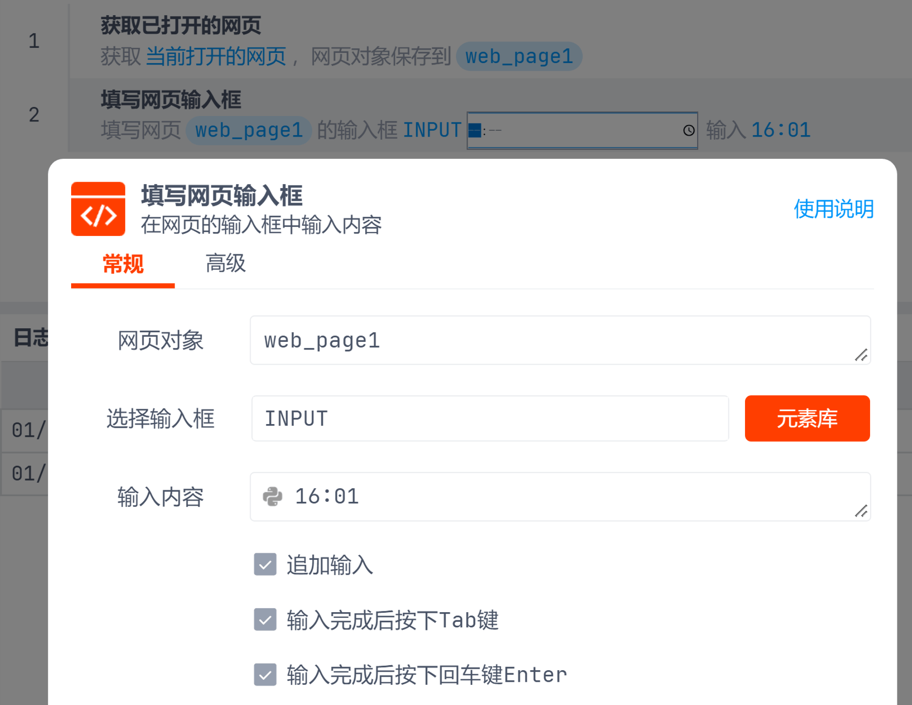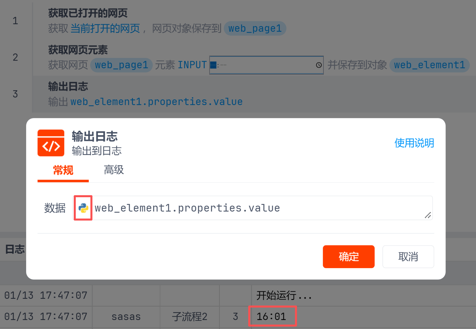 选择时间或者日期后运行下面的流程查看输入格式,例如type是time的格式