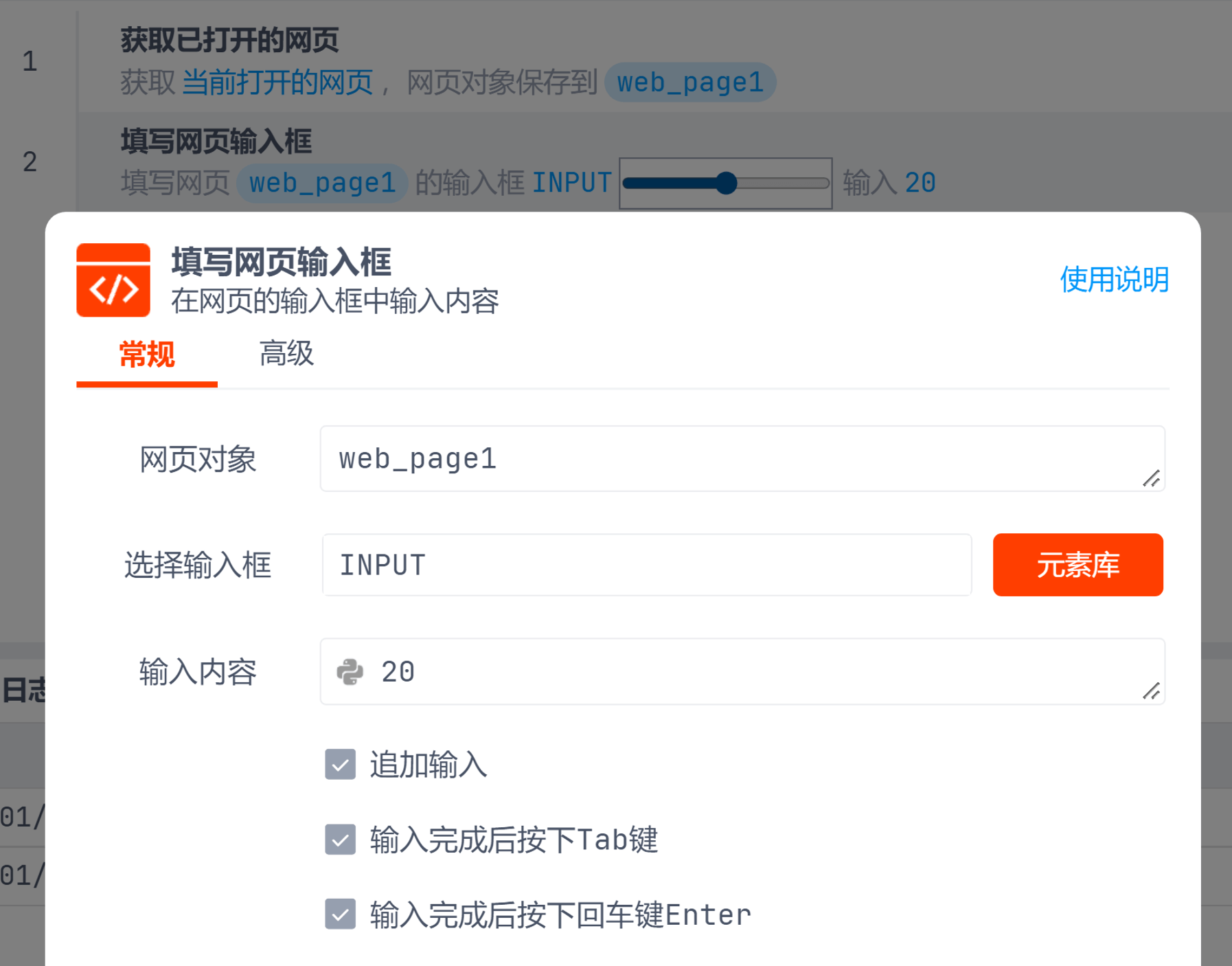 指令网页自动化元素操作设置范围选择器本页总览设置范围选择器 说明 可以使用 填写网页输入框 指令的静默输入快速设置范围选择器。不移动鼠标,不点击,直接通过网页接口修改范围选择器。 适用于type是 range的input元素,输入内容必须是数字 示例 <input min="0" max="100" type="range" value="20"> 提示 需要先安装曲辕RPA浏览器插件并且版本>=0.0.10 如何捕获及编辑元素属性参考 捕获及编辑网页元素属性 常见问题 参考 网页操作常见问题