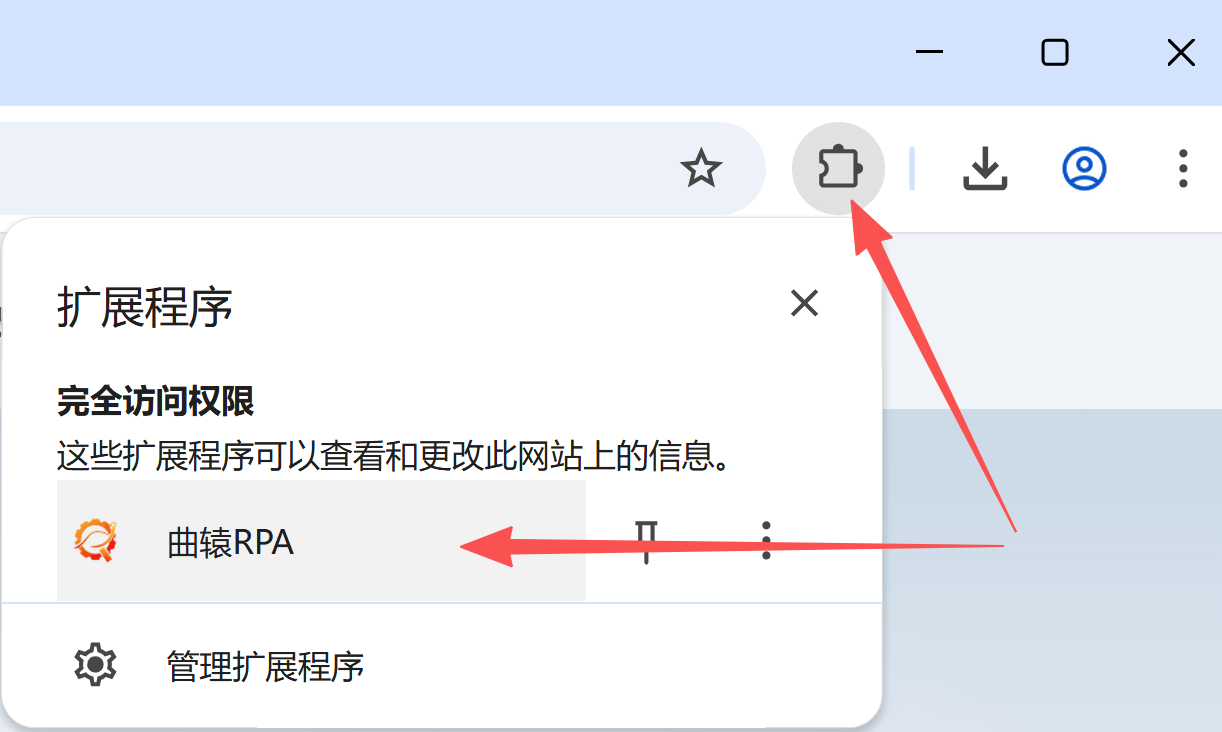 依次点击比特浏览器/AdsPower窗口右上角的 扩展程序 - 曲辕RPA 即可看到该窗口的envId。envId由曲辕RPA自动创建,每个比特浏览器/AdsPower窗口都拥有唯一的envId,卸载重装曲辕RPA插件会导致envId改变