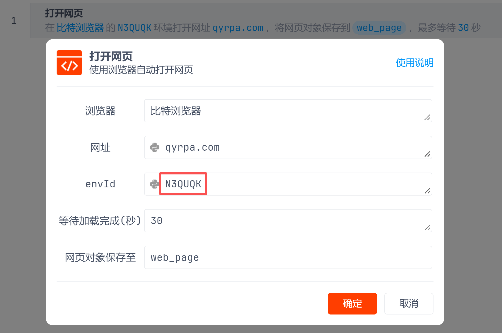 打开网页指令配置envId即可在对应的比特浏览器/AdsPower窗口打开网页。后续的点击按钮、填写输入框等操作只需要选择该web_page对象即可在指定的比特浏览器/AdsPower窗口执行自动化