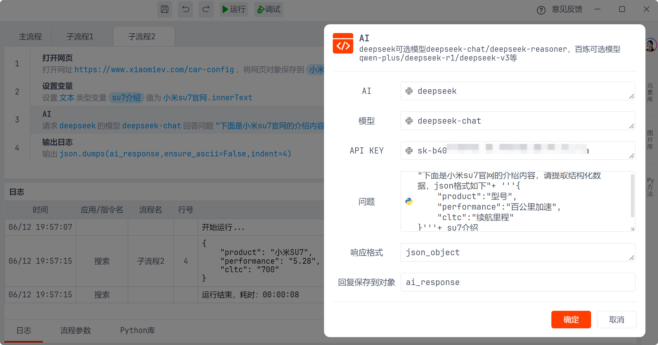 支持AI,只需要简单配置即可使用多种AI,例如通过deepseek分析小米su7官网参数并输出指定结构的json数据