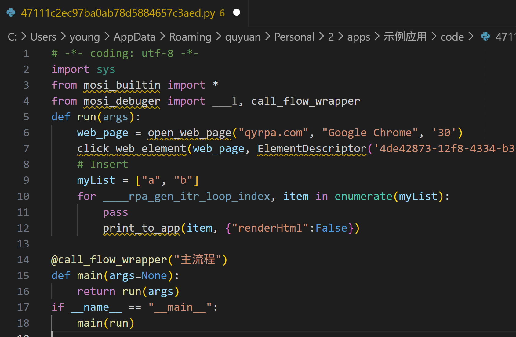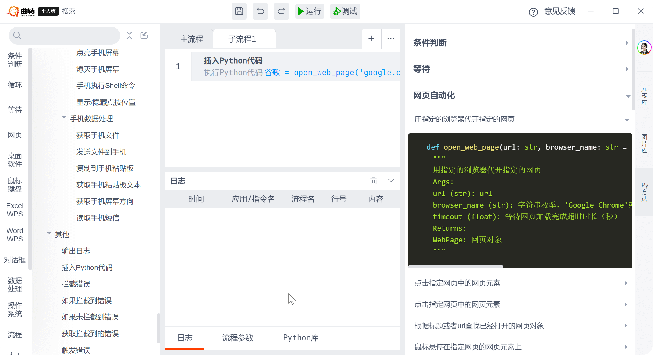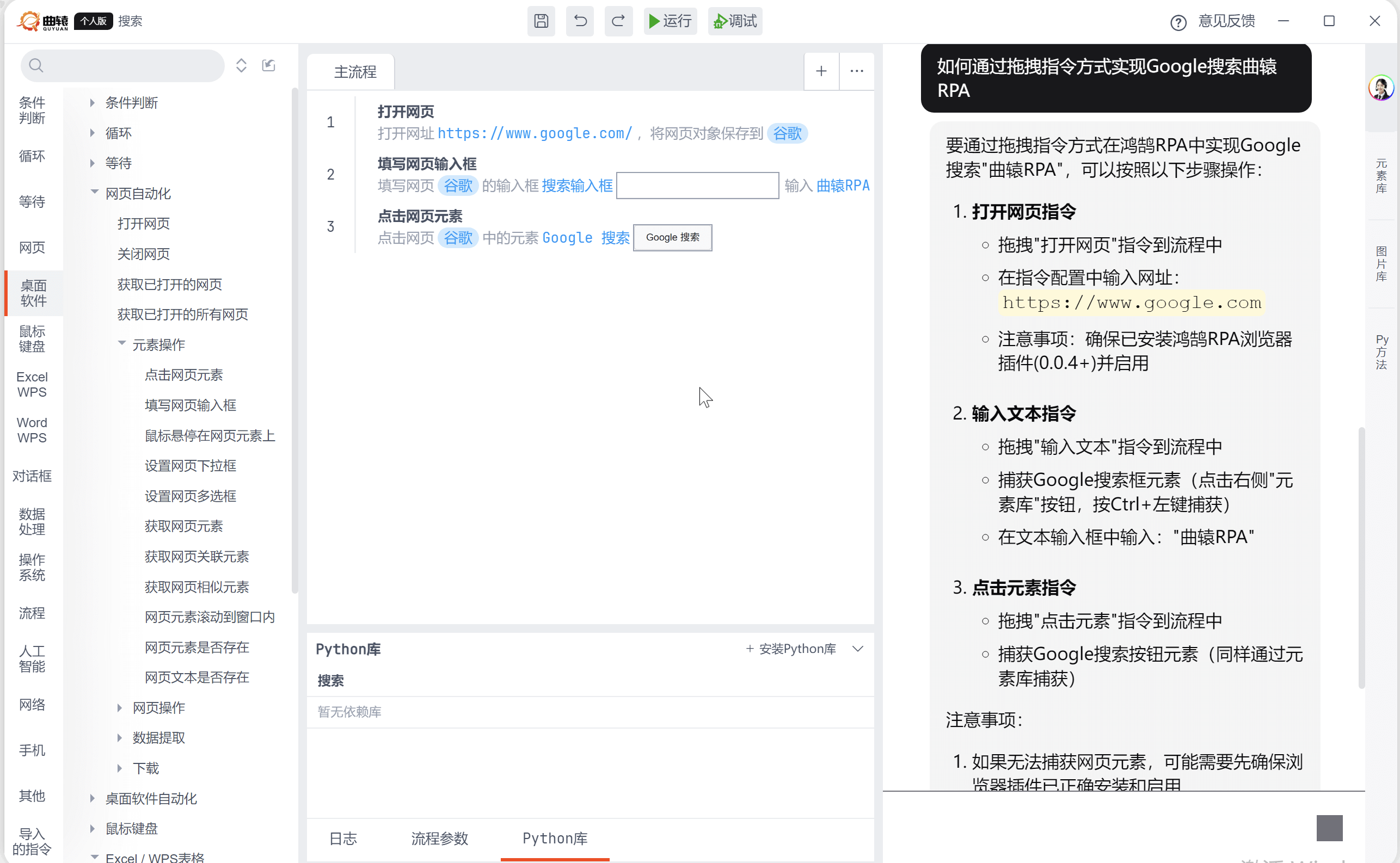 曲辕RPA是基于Python的自动化软件,可以无缝穿插Python代码,您搭建的流程会被翻译成Python代码并执行。