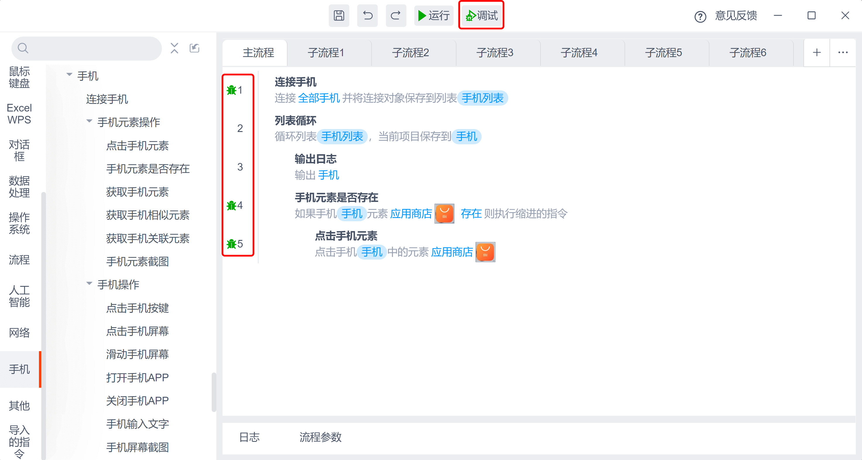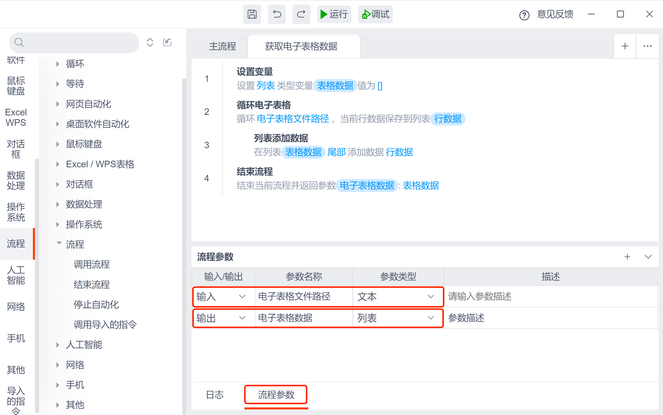 流程参数配置每个子流程的输入输出参数,使用流程-调用流程指令调用子流程 。您可以非常方便的实现单元测试(即:只测试局部流程)