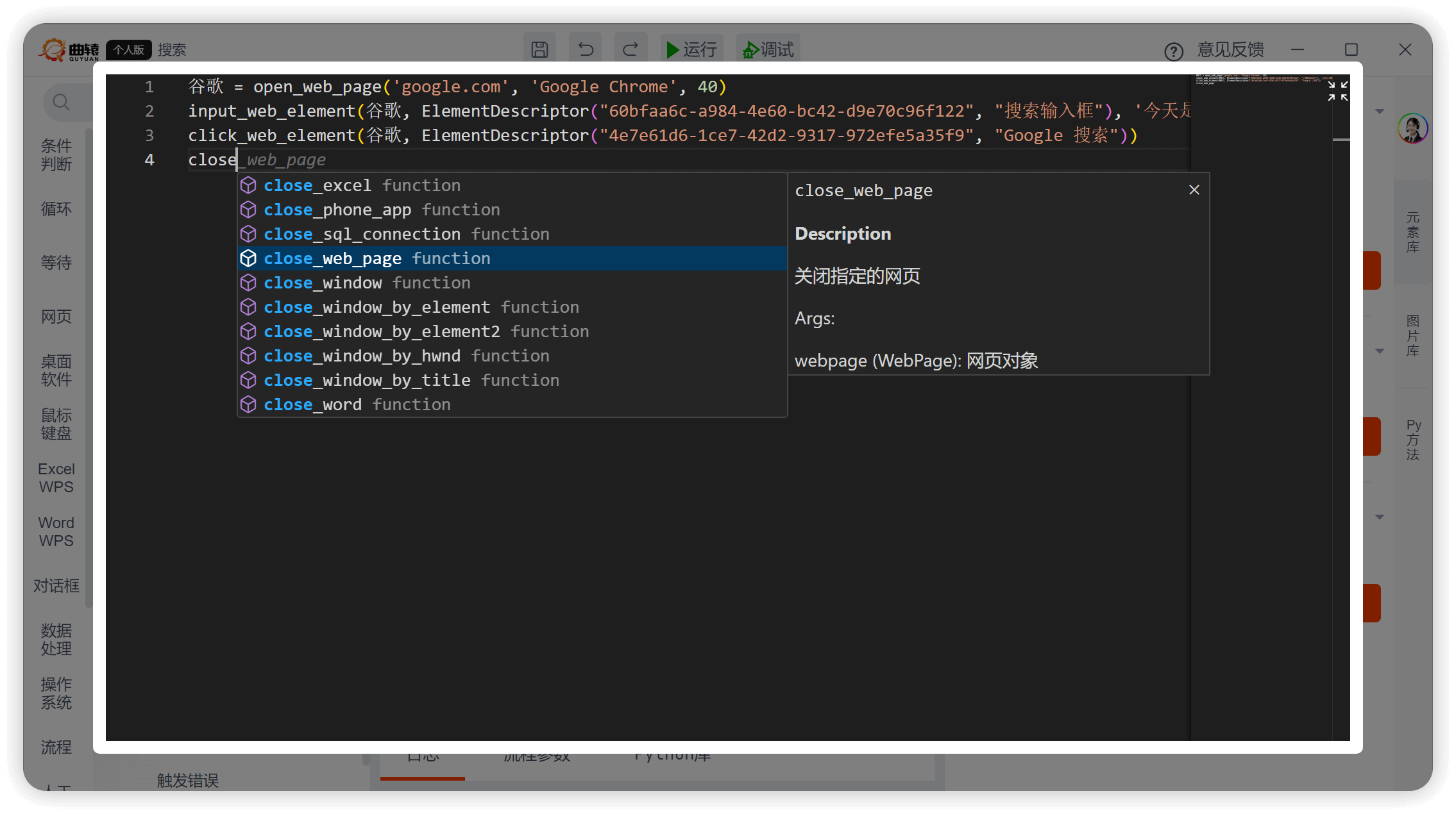 插入Python代码指令,您可以调用曲辕RPA内置的各种Python方法,也可以调用安装的三方Python库,代码会自动补全。