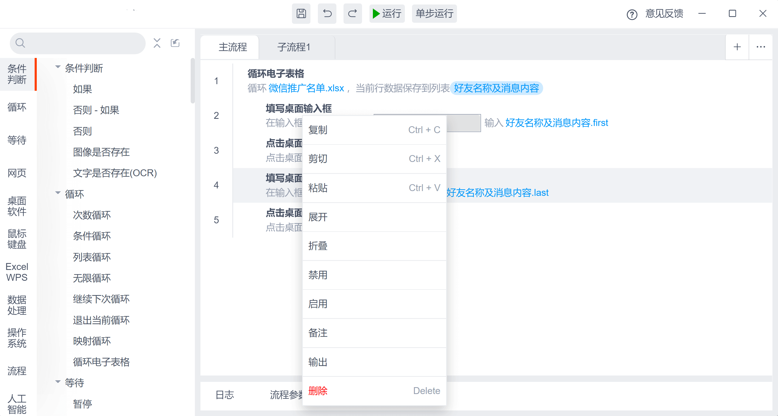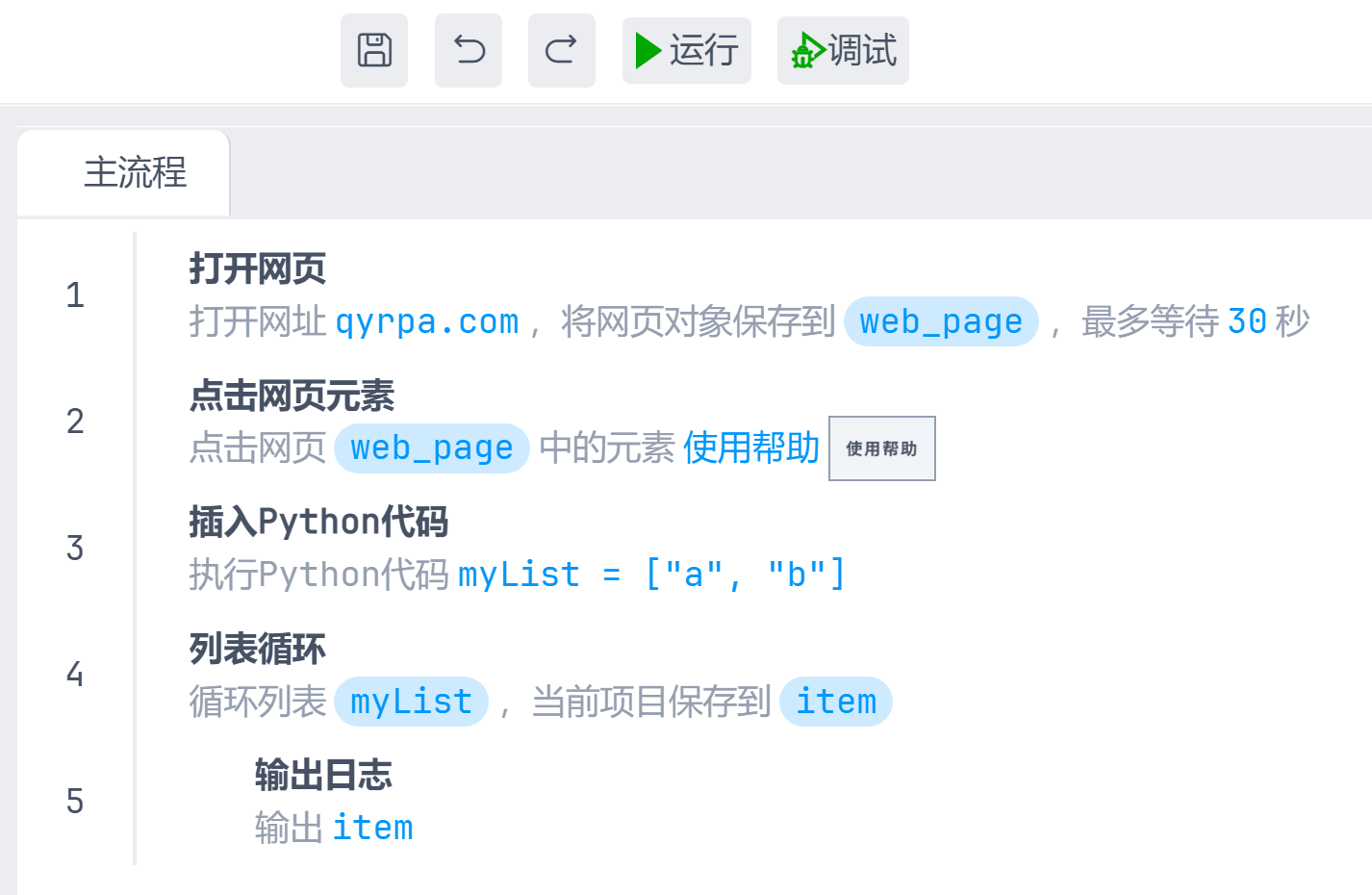 点击运行按钮即可执行当前展示的自动化流程。点击右侧的AI助手可以咨询各种相关问题。