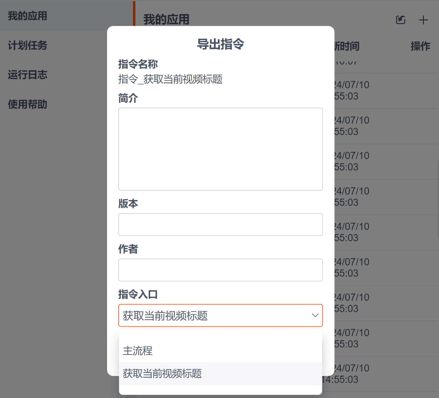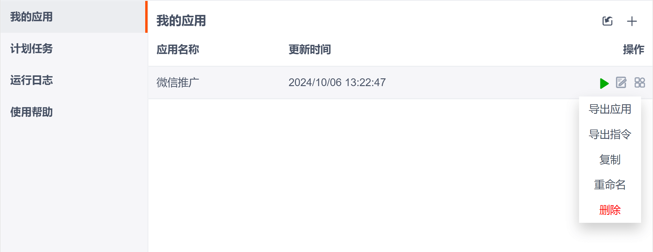 您创建的应用都会显示在这,您可以运行、编辑、导出等操作。导出的应用(.qya)/指令(.qyi)可以分享给他人使用