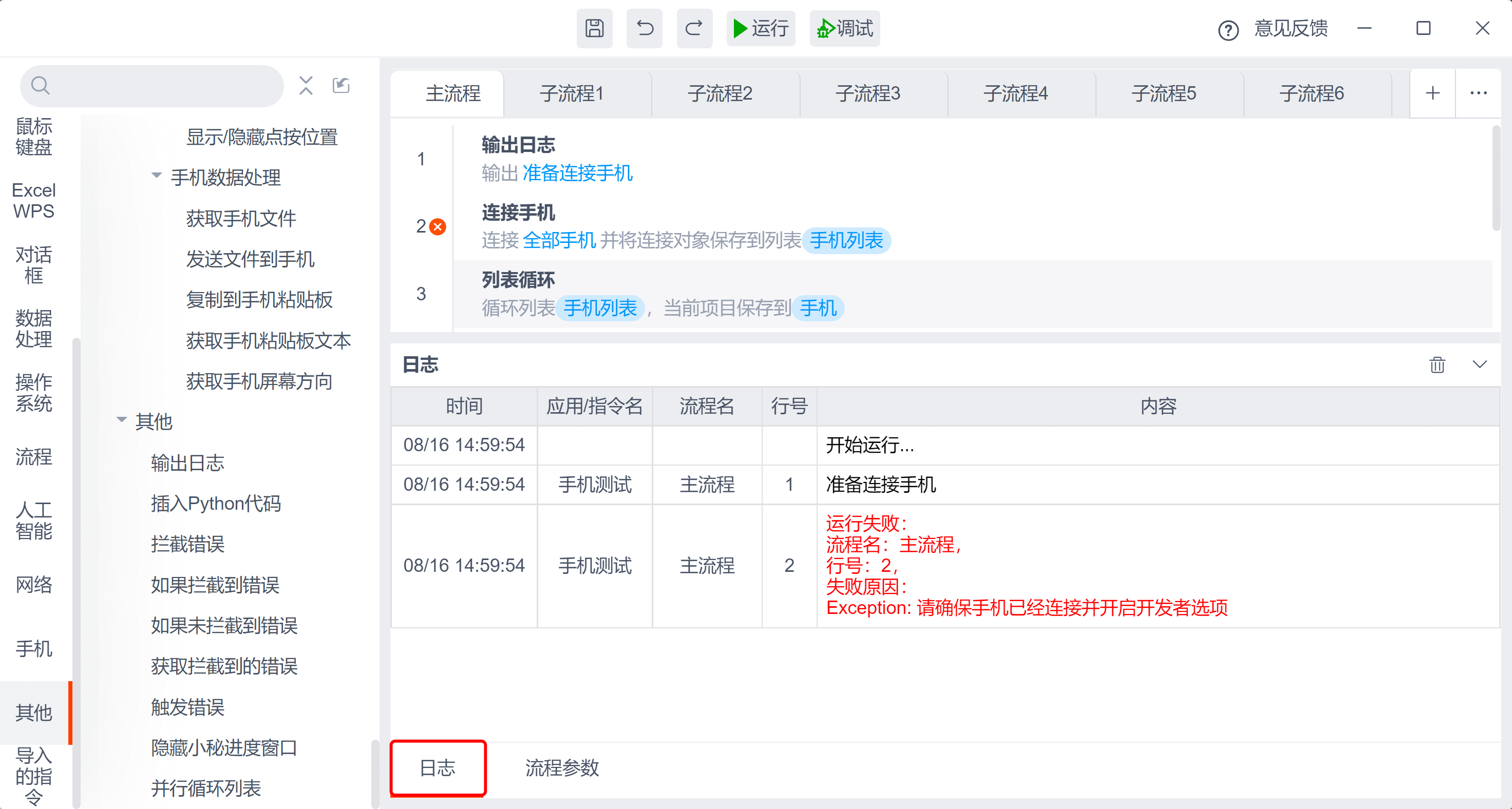 使用输出日志指令输出的日志会展示在日志中,流程错误原因也会出现在日志中